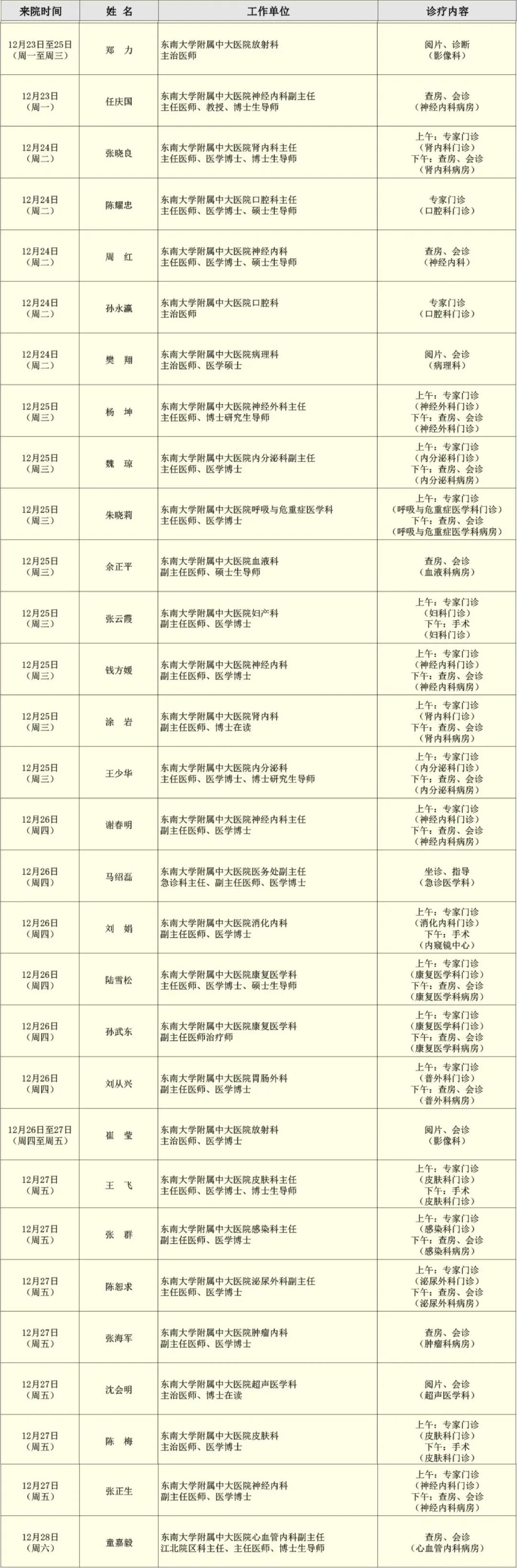 2024年12月23日—12月28日,将有东南大学附属中大医院神经内科、内分泌科、消化内科、呼吸与危重症医学科、肾内科、心血管内科、肿瘤科、血液科、普外科、神经外科、泌尿外科、感染科、急诊科、妇科、口腔科、皮肤科、康复医学科、超声医学科、病理科、放射科的30位专家来院开展诊疗活动。 具体信息如下:  专家简介  张晓良 东南大学附属中大医院肾内科主任。英国卡迪夫大学医学博士,教授,主任医师,博士生导师。中国健康促进基金会苏皖赣血液净化血管通路联盟理事长,中国肾脏病大数据应用创新联盟常务副理事长,中国医药教育协会临床肾脏病学专业委员会全国常委,中国研究型医院协会血液净化分会全国常委,中国医师协会委员,中国罕见病协会委员,江苏省医师协会肾脏病分会副会长,江苏省医学会肾脏病专科分会常委,江苏省罕见病学会法布雷病组副组长,中国中药协会肾病中药发展研究专业委员会全国常委。 主要研究方向为钙化防御基础与临床研究;疑难罕见肾脏病分子诊断研究;数字技术赋能肾脏健康管理;炎症细胞在肾脏纤维化中作用机制。